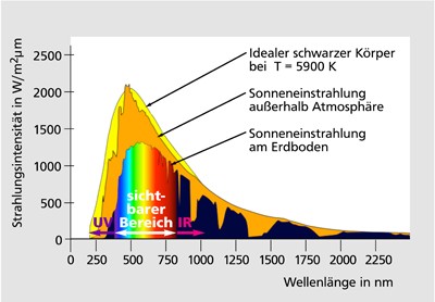 Záření Slunce (oranžově zvýrazněná křivka na obrázku) se podobá záření ideálního černého tělesa o teplotě přibližně 5 900 K (žlutě zvýrazněná křivka).