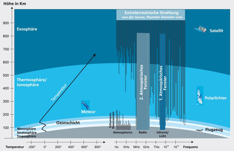 Selektivní propustnost atmosféry je označována pojmy "atmosférická okna". První okno umožňuje průchod viditelného světla a blízkého infračerveného záření. Druhé okno, označované jako "rádiové okno", propouští vlnové délky mezi přibližně 3 mm a 30 m. Toto druhé okno je mnohem širší než první a pokrývá širší rozsah rádiových vln.